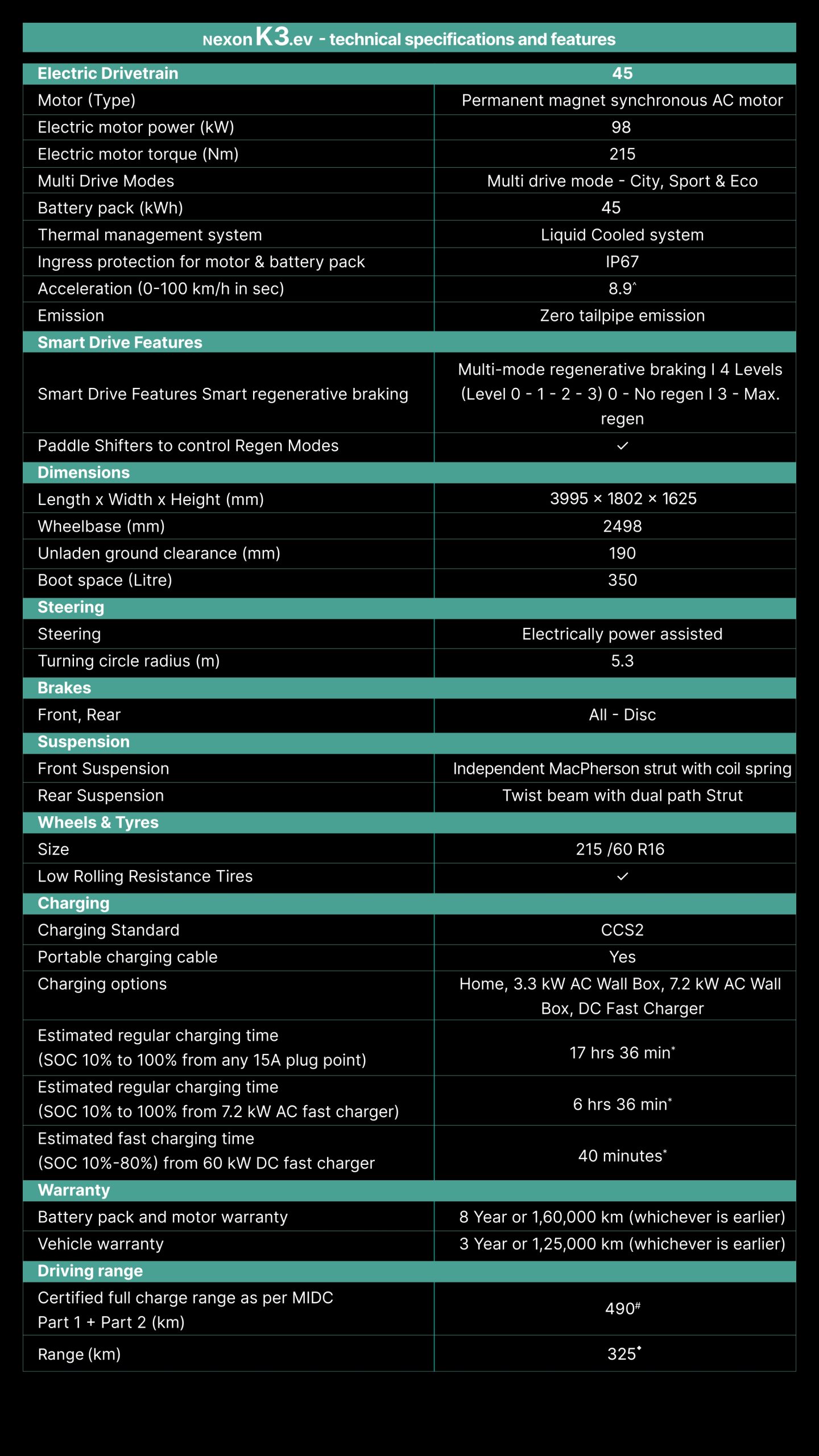 NEXON K3.EV EMP+ 45 = 48,99,000 Dimensions 3993 × 1811 × 1606 cm Color EMPOWERED OXIDE, PRISTINE WHITE, DAYTONA GREY, INTENSI TEAL, FLAME RED Variations NEXON K3.EV EMP+ 45 Brochure Download Brochure Demo Video